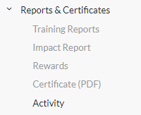 June 3, 2025 Activity Report This article outlines the HackEDU Activity page. Activity The activity page provides admins with a log of any training notifications have been sent, including the date & times they were sent and the recipient list. To view, navigate to Admin > Reports & Certificates > Activity.