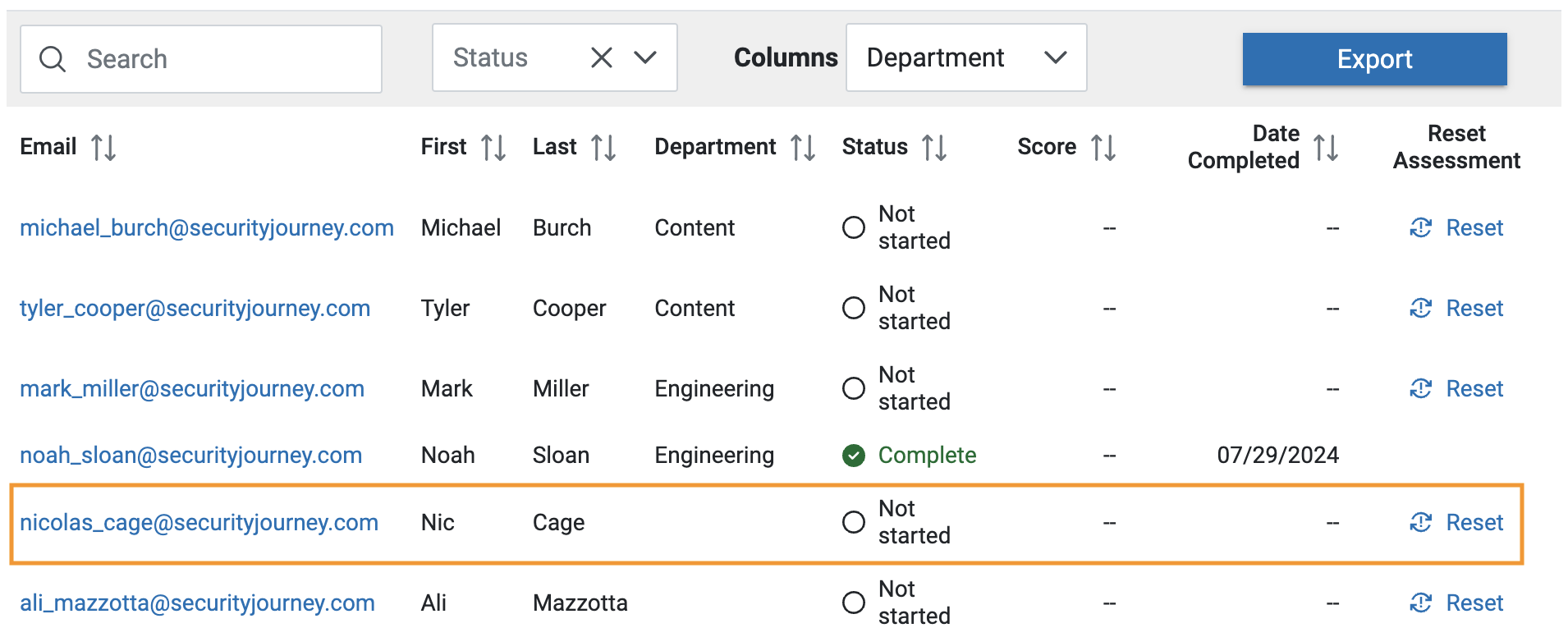 Then, click the 'Reset' link in the table by their name. Your developer can launch their Assessment from scratch after you've reset!