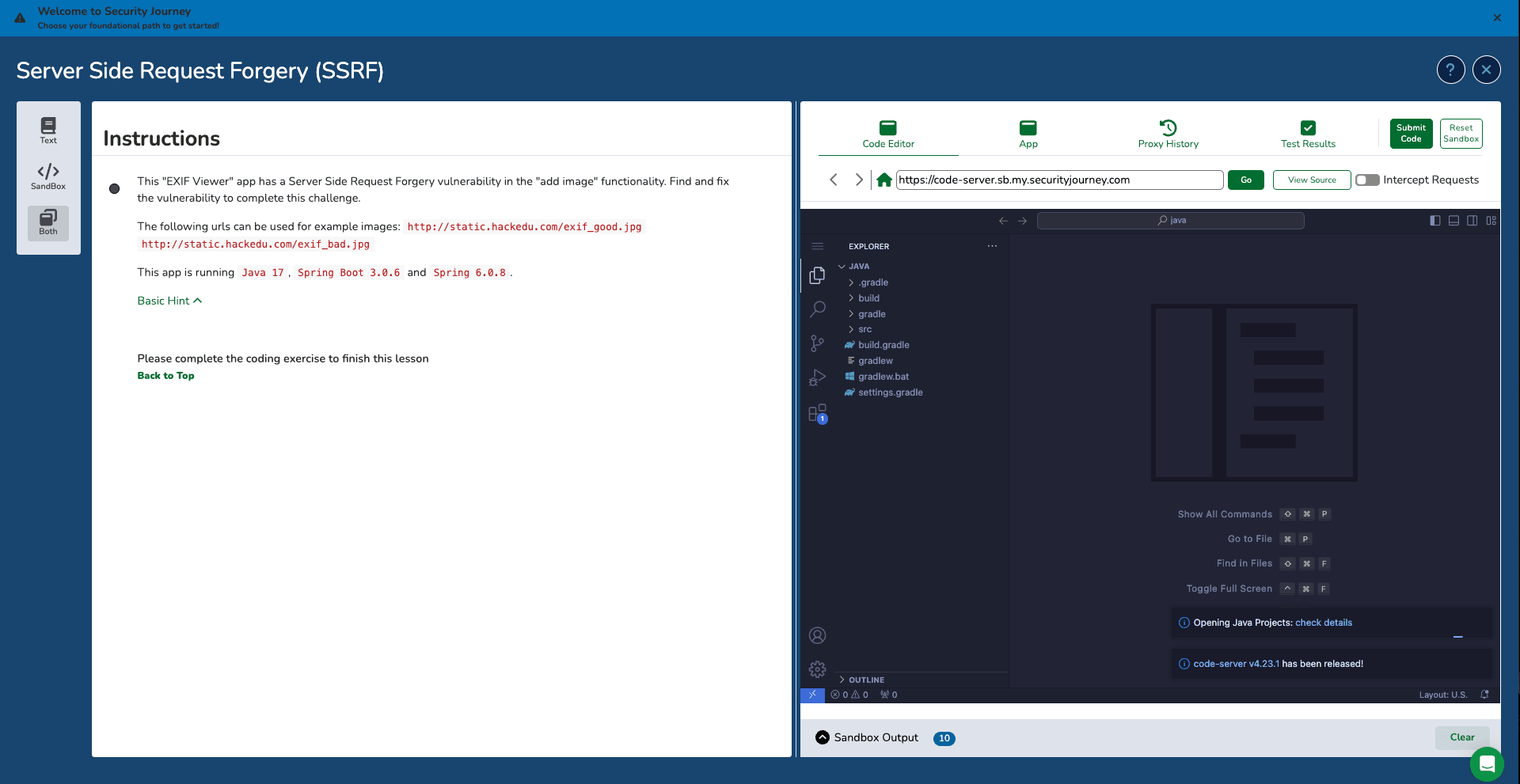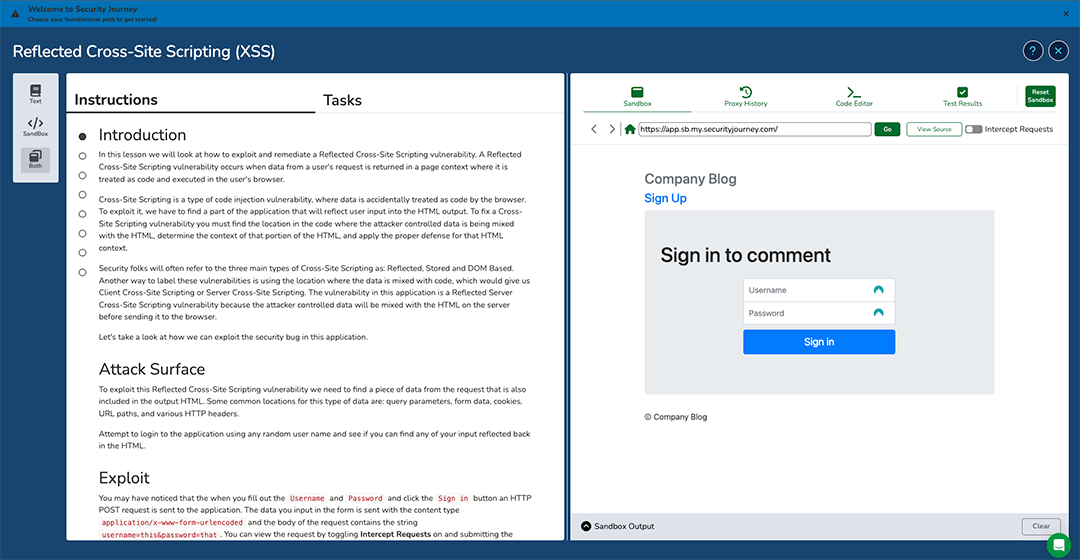 These lessons guide the learner through the various aspects of the vulnerability being taught - starting with an explanation, how to exploit and then how to remediate.