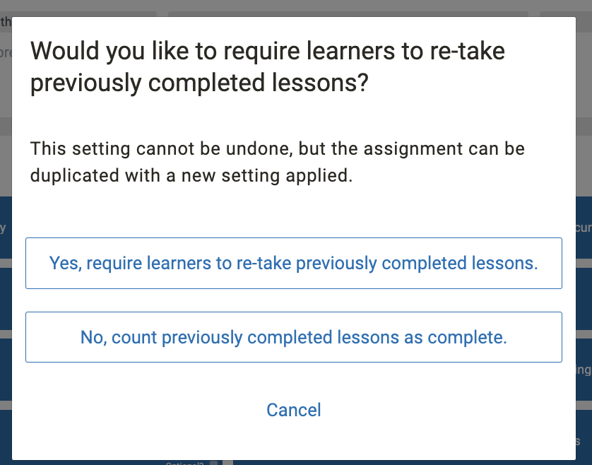 You will be prompted to choose whether or not you want learner's to have to re-take previously completed lessons.