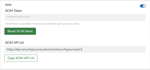 7. From here, check the "Enabled API Integration" check box and copy paste the SCIM API URL and SCIM Token from the SCIM settings in Security Journey. For more information on generating a SCIM API URL and Token check out this article.
