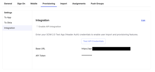 8. Once you've copied and pasted the SCIM API URL and SCIM Token into Okta, you will need to click "Test API Credentials." If successful, it will look like this.