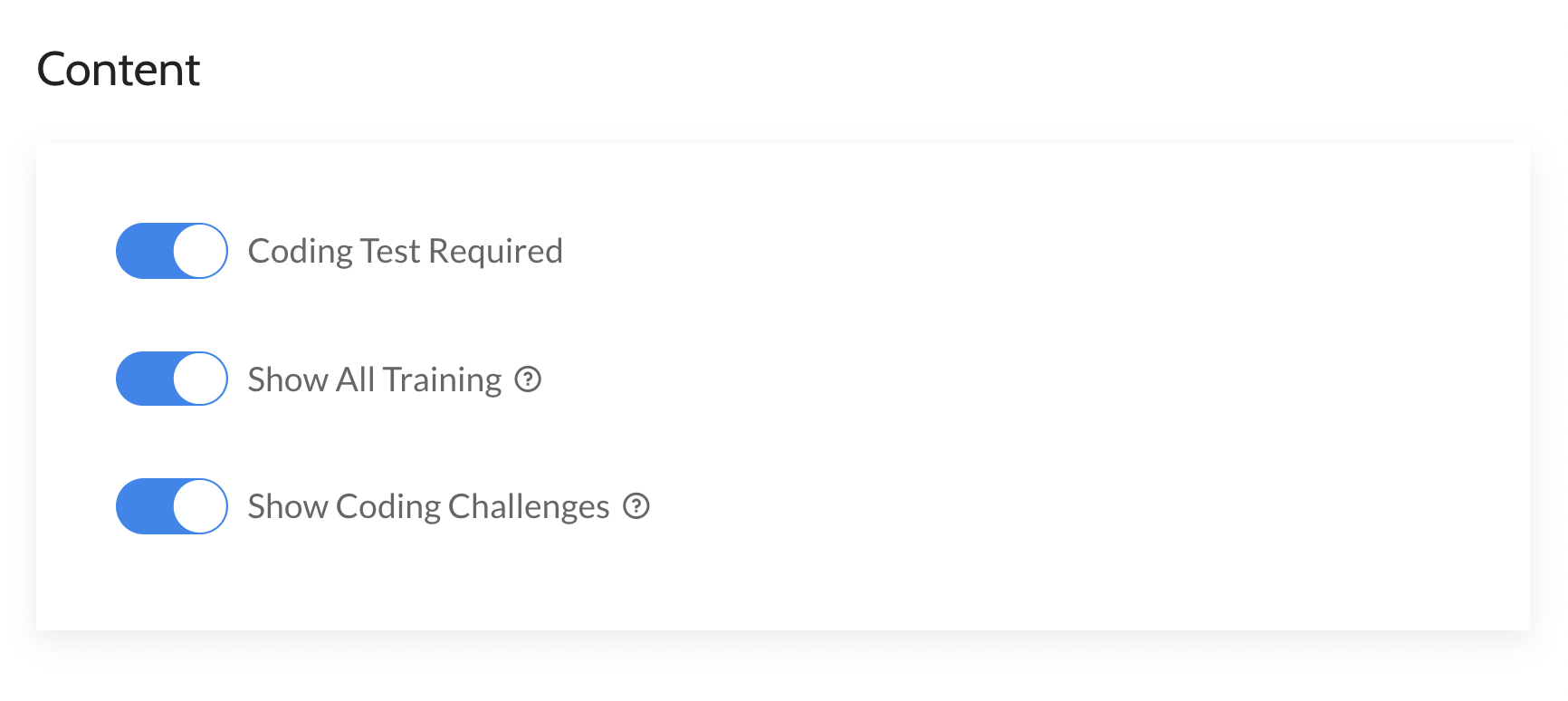 These toggles allow you to control whether or not your developers are required to take coding tests, see all training available to the organization or access our coding challenges. We will break down those three settings below: