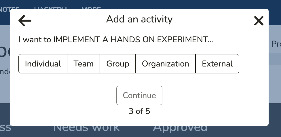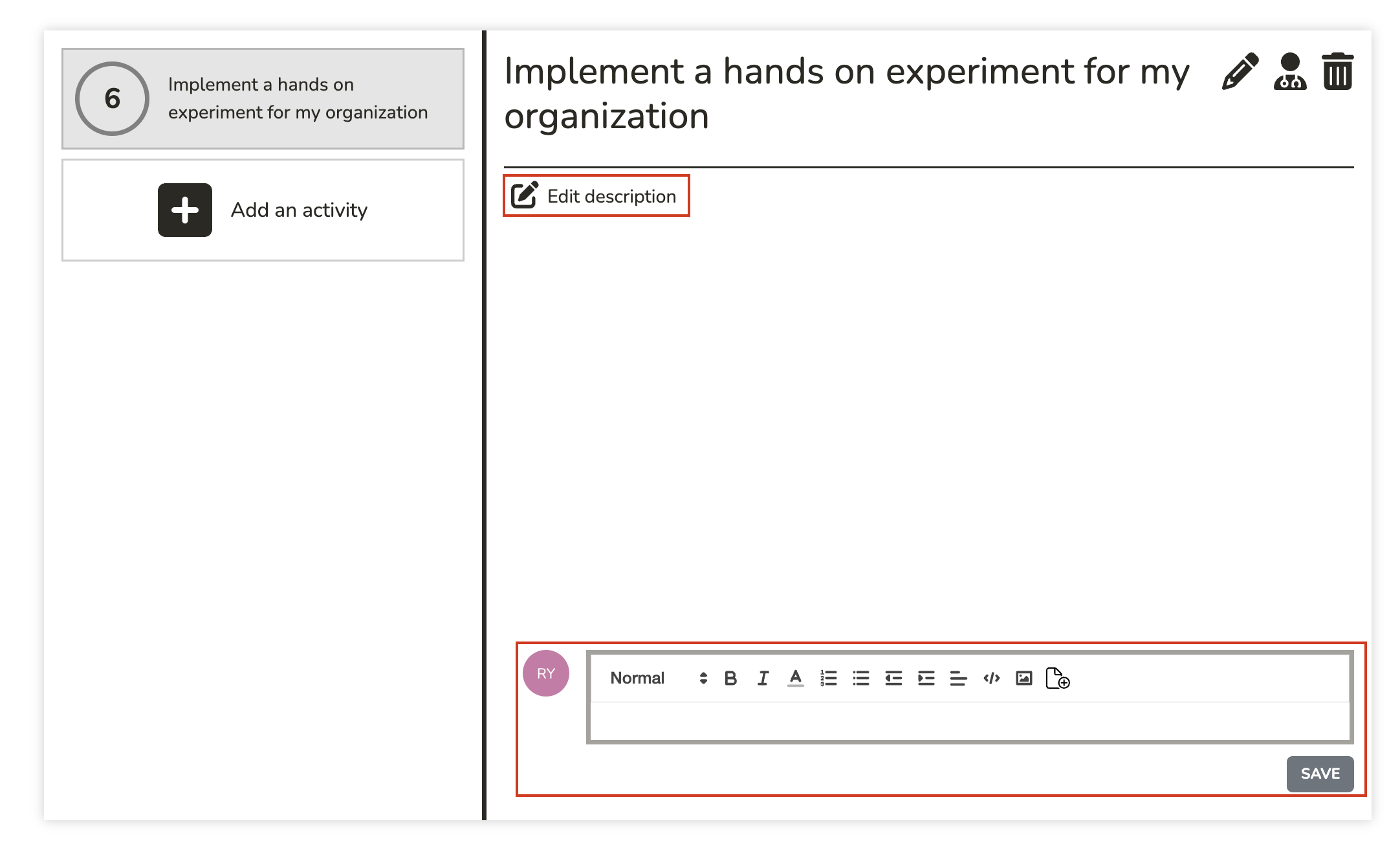 You can continue to add activities or close the prompt to begin editing the activities you created in your Champion Passport. We give you the ability to edit the description and add your personal details or plans for implementation.