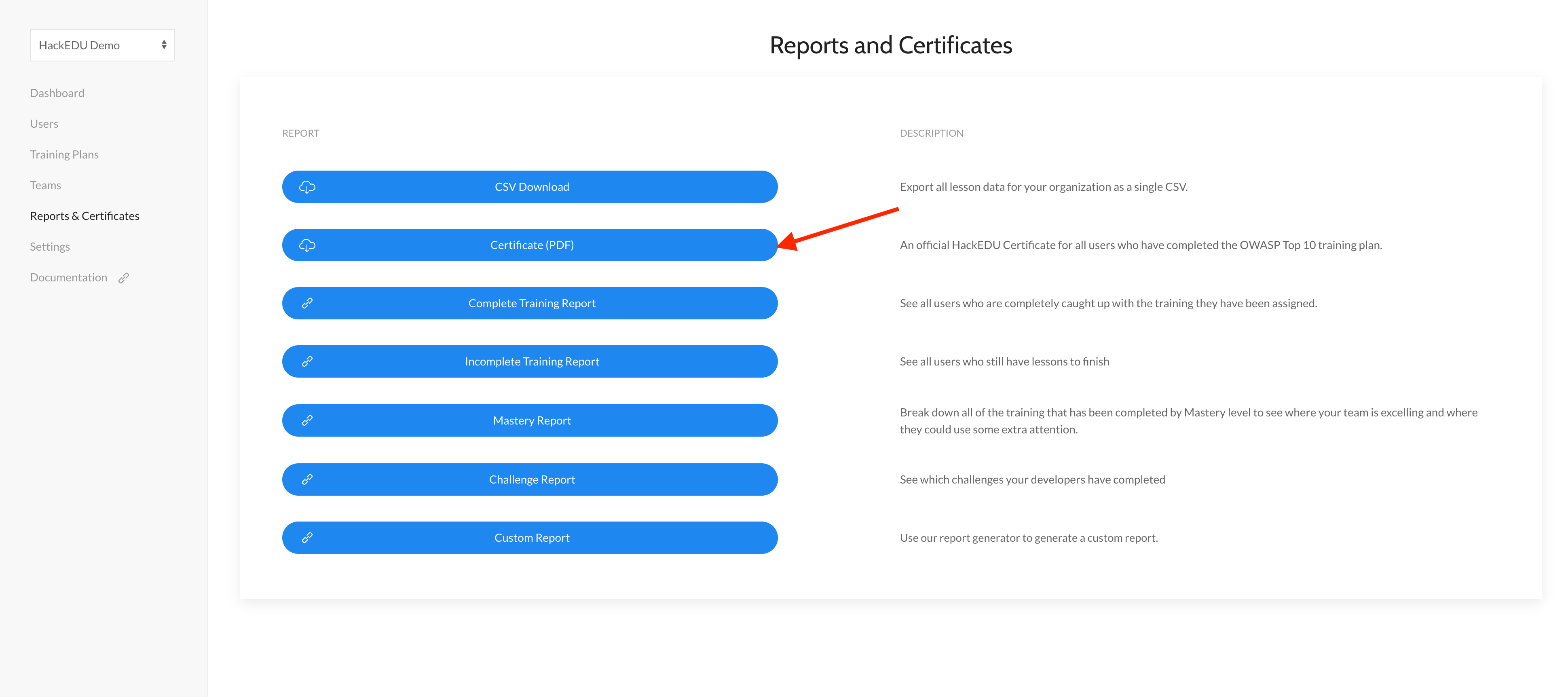 The Organization Certificate includes list of all users who have completed the full OWASP Top 10 training plan as well as a date of completion. This will satisfy training requirements for PCI Compliance.