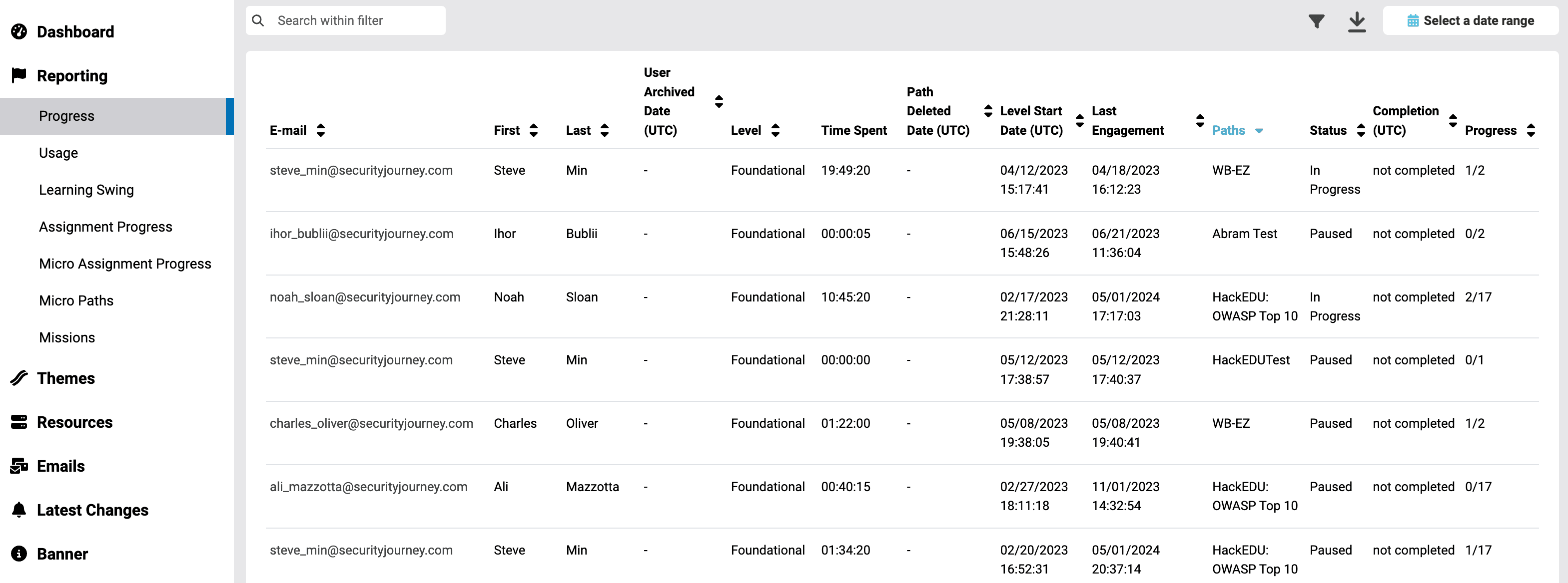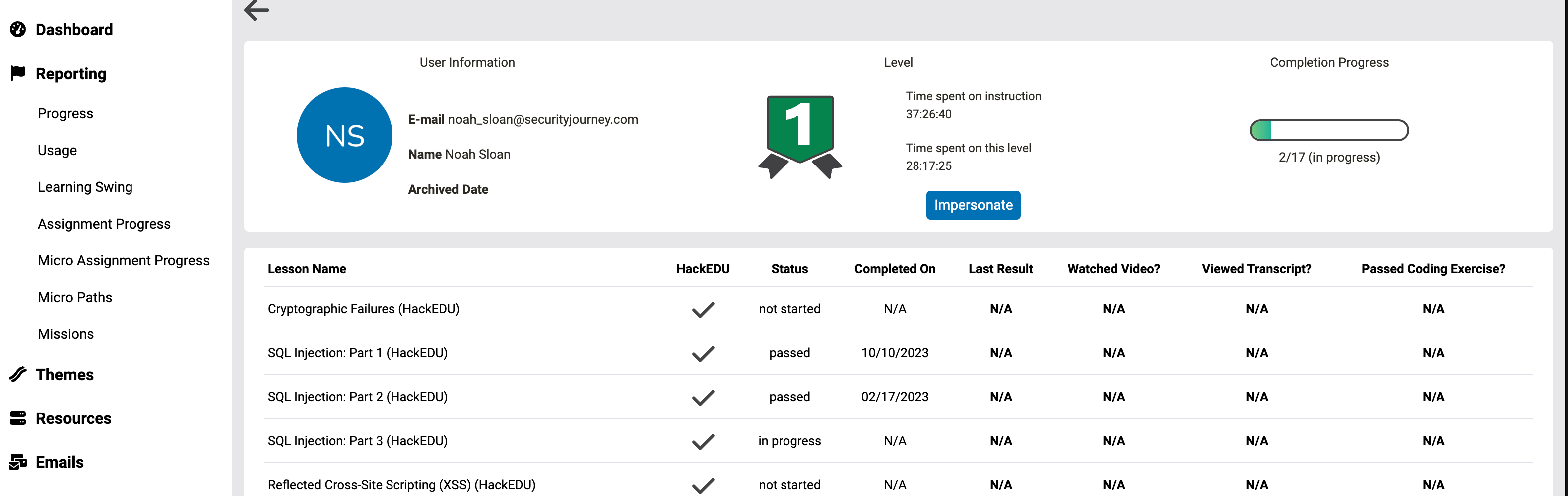 You can review individual user's platform metrics by navigating to Admin > Progress.