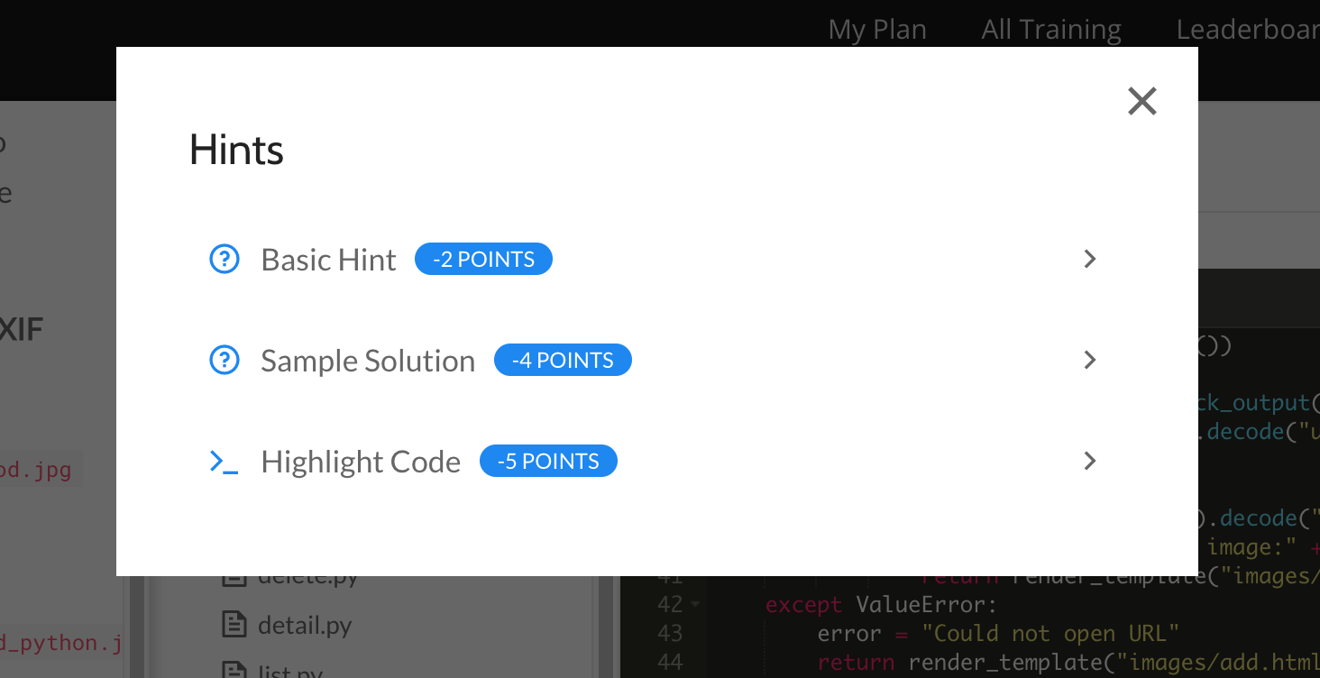 Most coding challenges have hints, and each hint takes a set number of points away from your score:
