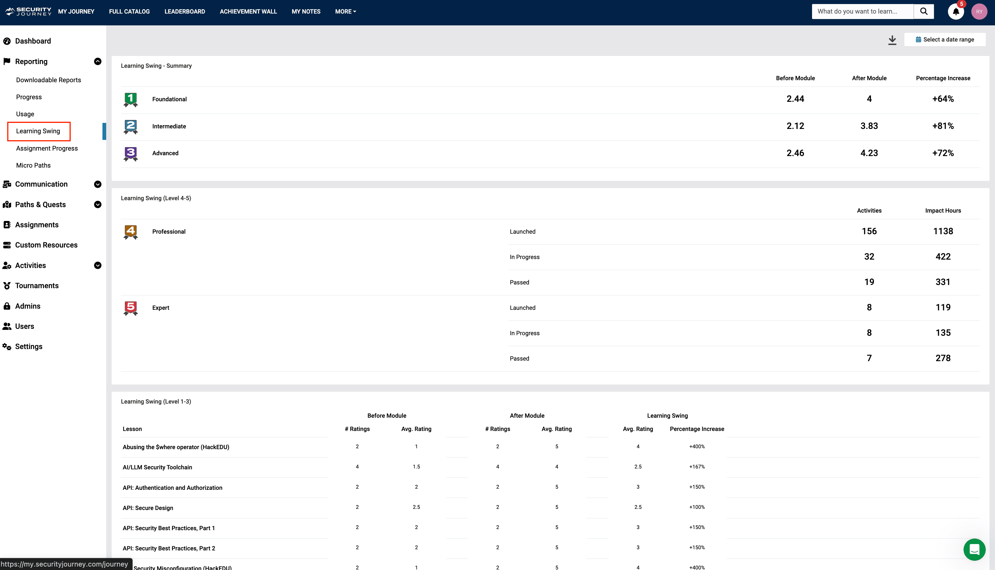 Security Journey dedicates an entire report to your learner's Learning Swing data. This is located under Admin > Reporting > Learning Swing.