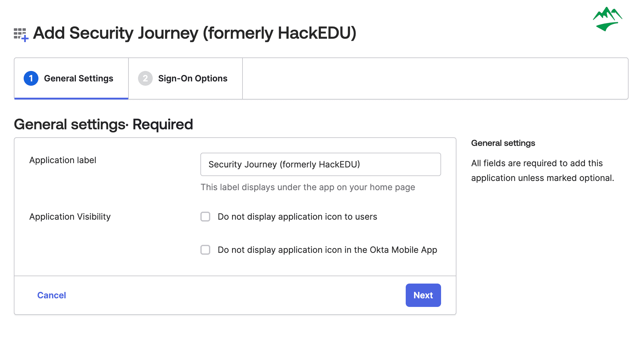 4. After adding the application, you can update the application label (if desired). You will also want to check the box under Application Visibility > Do not display application icon to users. Then click Next.