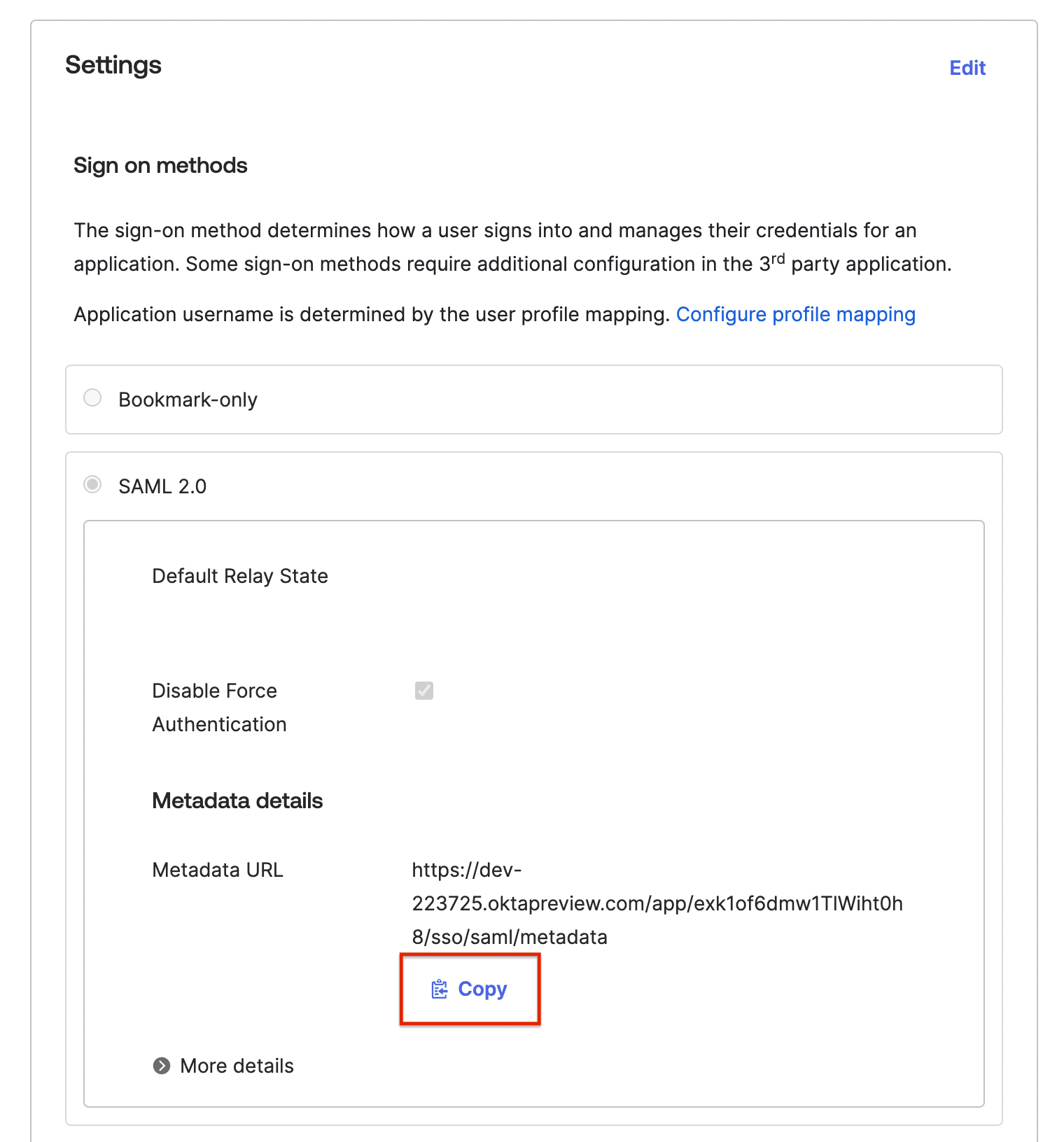 6. Finally, you will see your Sign-On Options. The default will be SAML 2.0. You will need to locate your Okta Metadata URL to copy and upload to Security Journey.