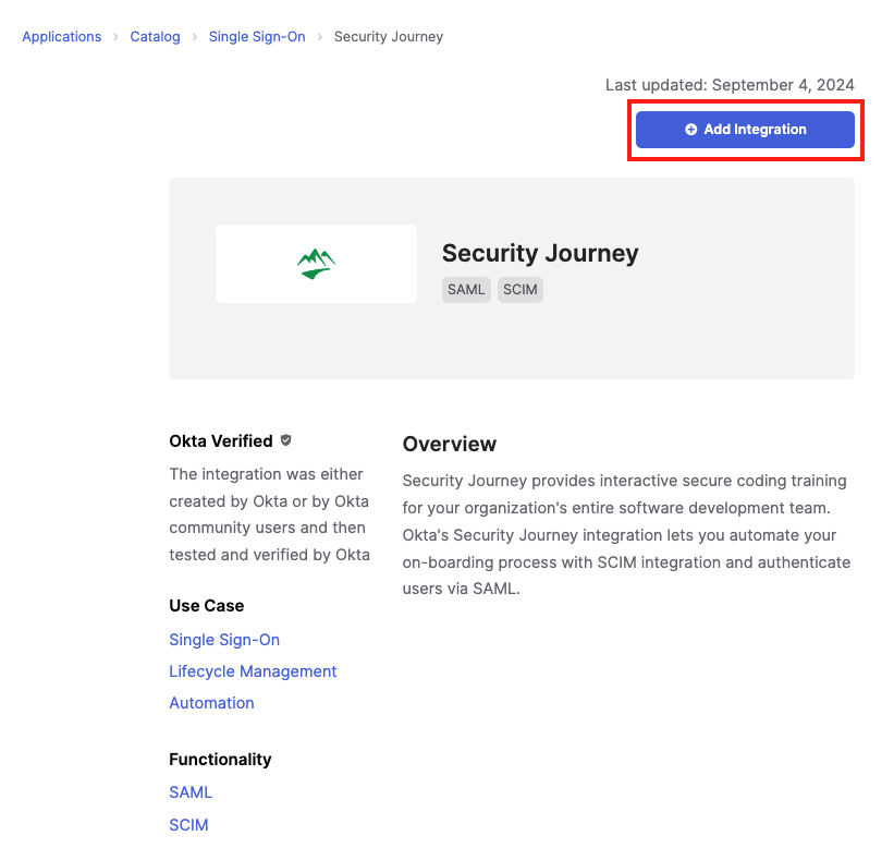 Okta is an enterprise identity management and single sign-on service that integrates with applications in the cloud, on-premises, or on a mobile device. This documentation describes how to configure a single sign-on partnership between Okta as the Identity Provider (IdP) and the Single Sign-On Service (SSO) for Security Journey as the Service Provider (SP). All SSO communication takes place over TLS/SSL.
