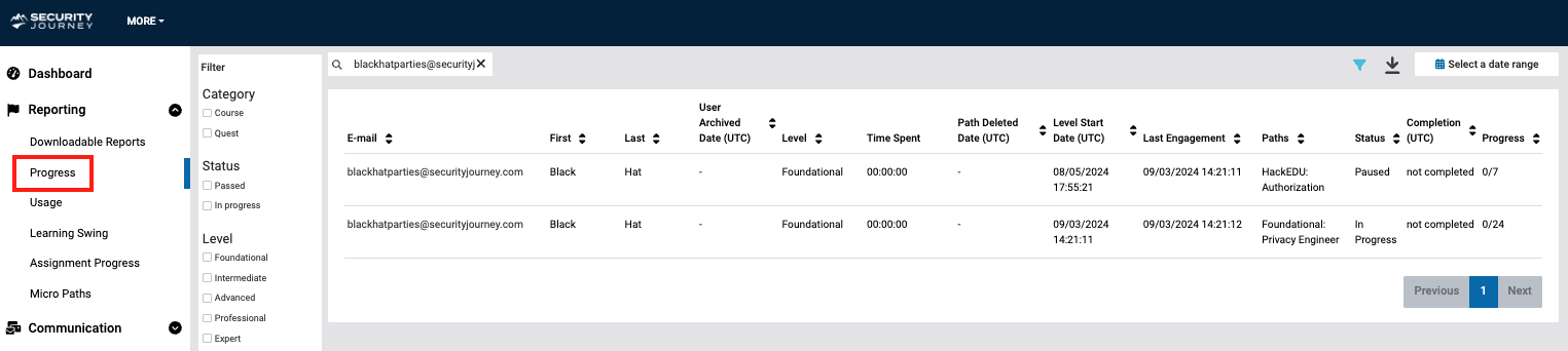 If your company is leveraging learner attributes, you can also use these attributes to filter your progress. Any filters applied in the UI will apply to the downloaded report.