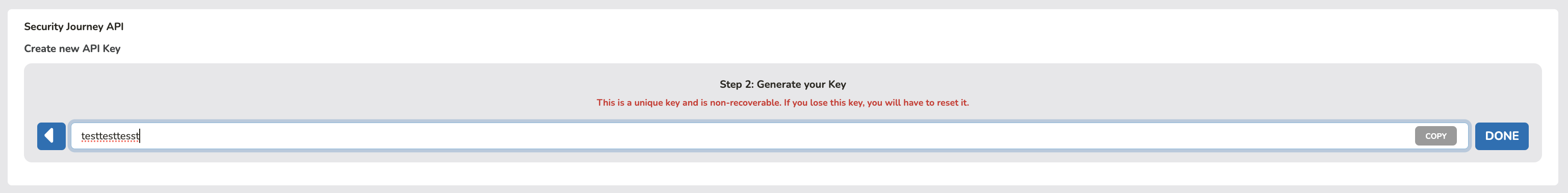 If you don't click "Done" the key will not be saved and will be invalid. You should see this screen if the API Key was generated successfully.