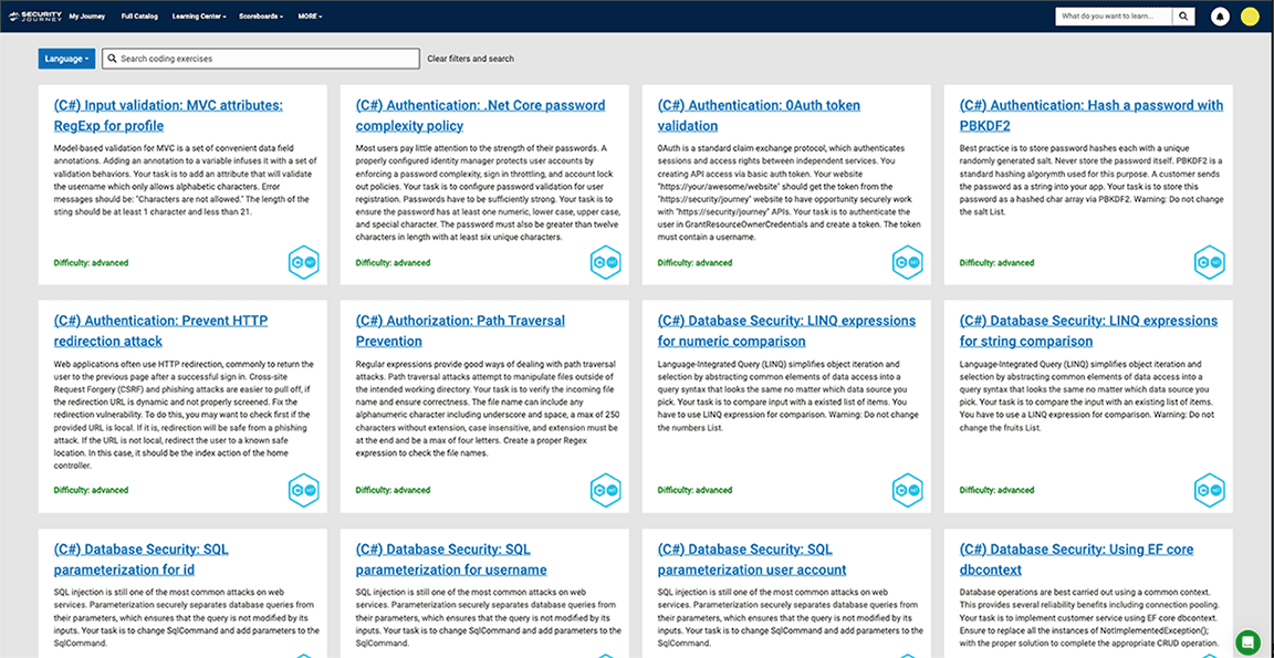 The Exercise Explorer is where you can find Security Journey's full catalog of coding exercises. We provide you with the ability to filter by language or use keywords to find what coding exercises are available. These exercises can be taken as stand alone pieces of content within a Mission, Tournament or as part of the learning within many of our Advanced Video lessons.
