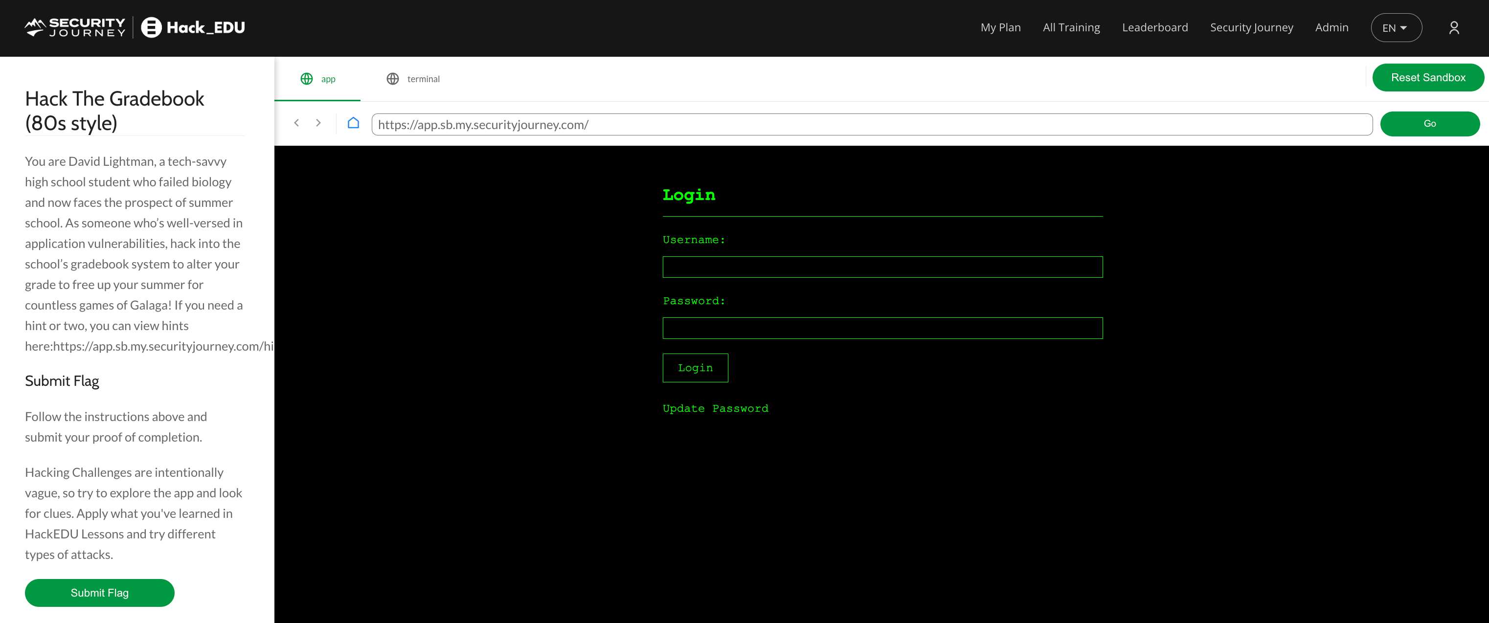 Learner are presented with the login page for an old-school gradebook application inspired by the 1983 Movie WarGames. Check it out here.