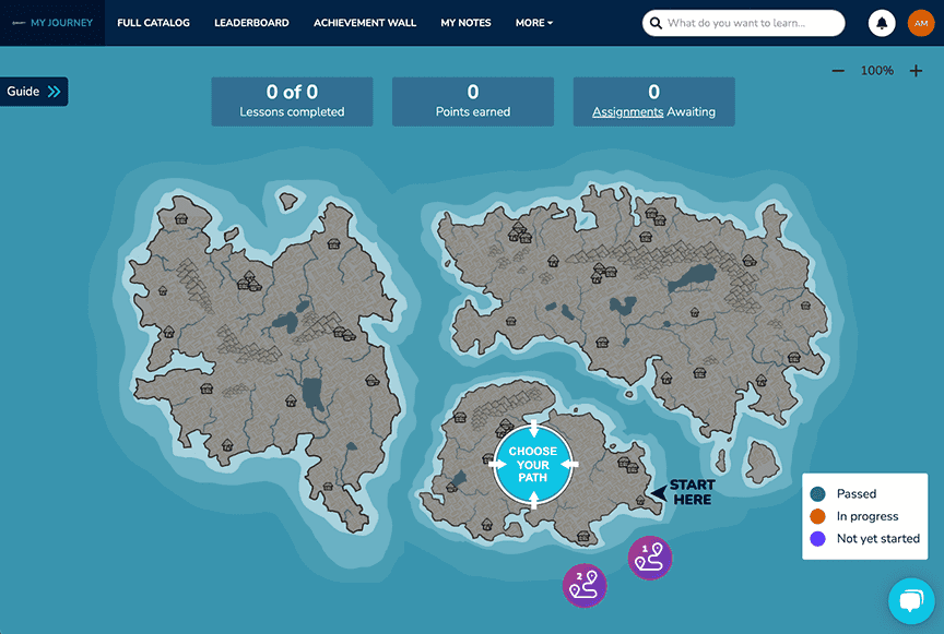 Today is a big day! We've refreshed and simplified our Security Journey Dojo UX/UI so that learners can better navigate the Platform and more easily find and complete the next lesson in their assignment. Lessons completed, points earned and assignments awaiting is prominently displayed on the main map. A new, pulsating orb helps guide learners to their position and the next module on the map.