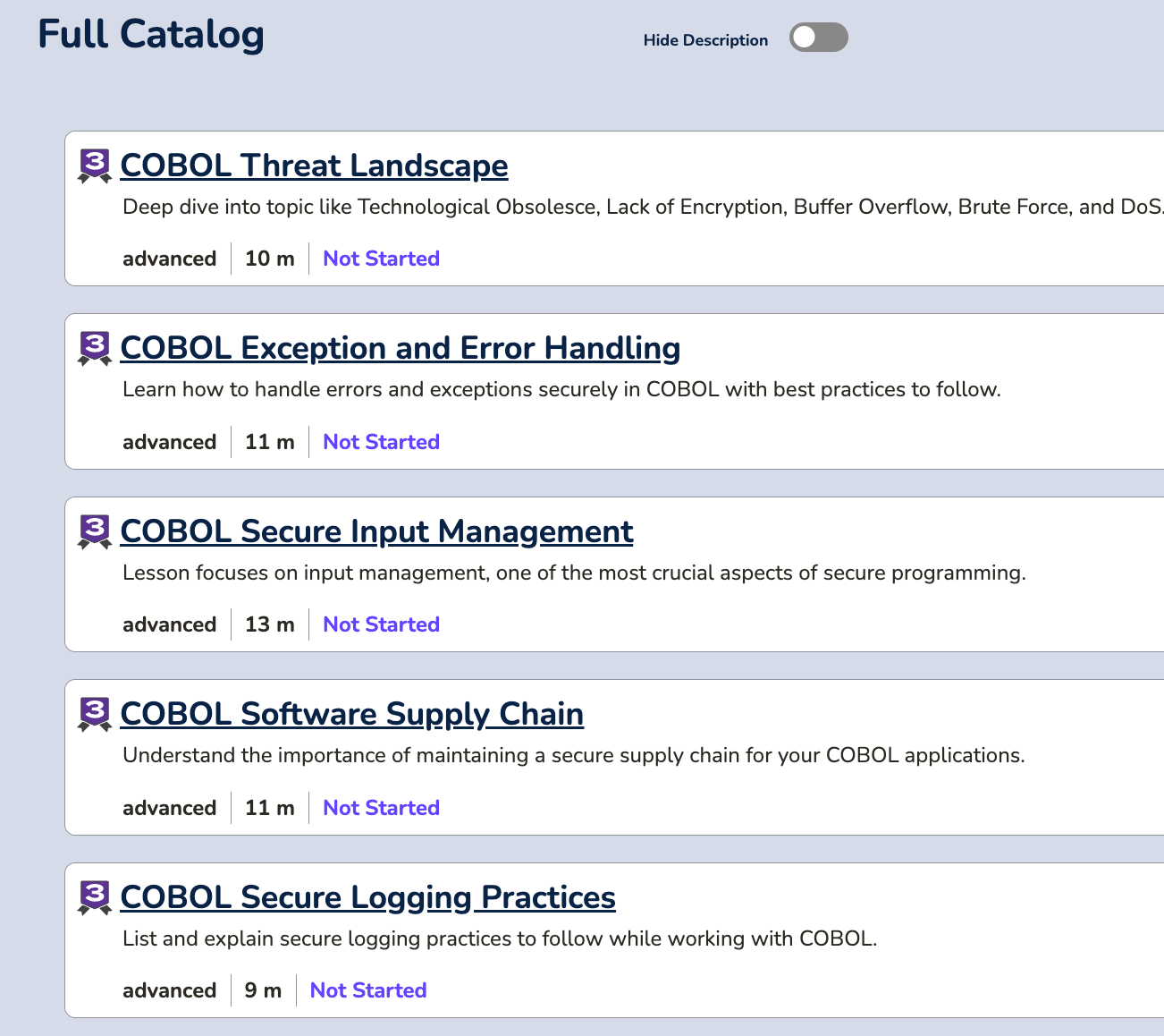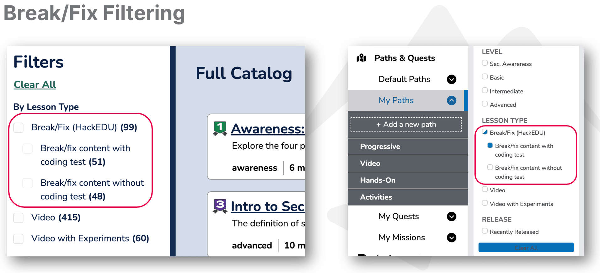We've made some changes to our Full Catalog feature in preparation of HackEDU Break/Fix content being available in my.securityjourney.com. We've added a new filter called "By Lesson Type" so learners and admins can filter content by: