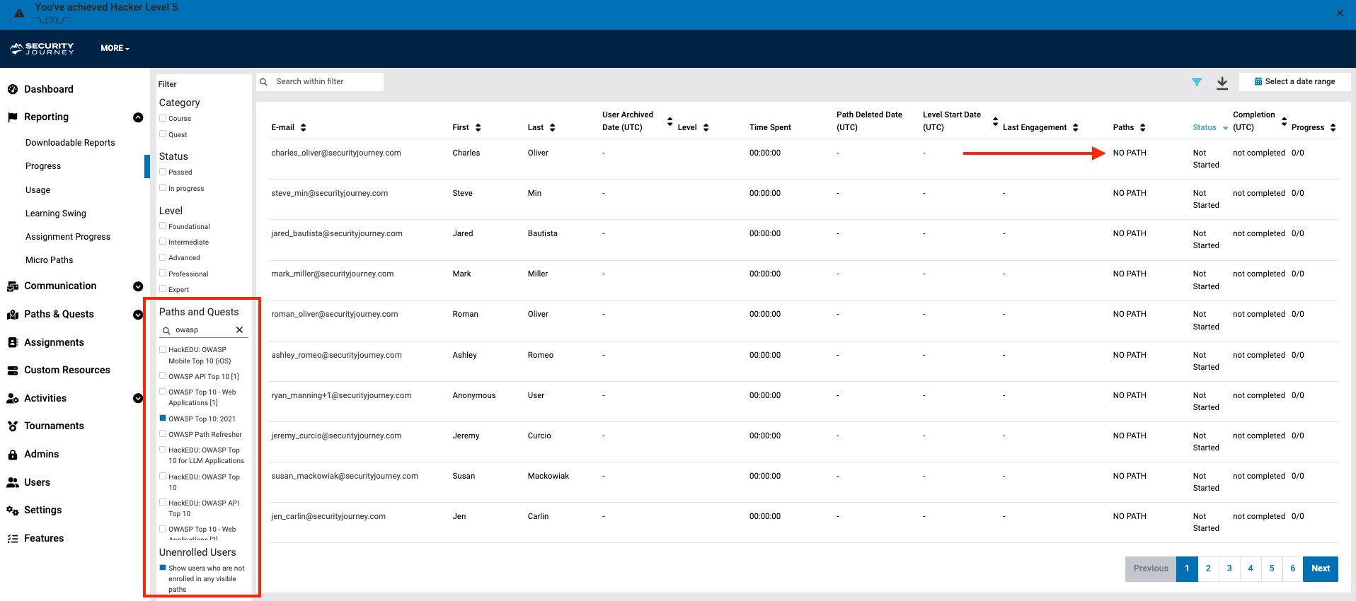 Within the Progress Report and Assignment Progress report you can filter on path enrollment or identify learners who have not yet enrolled in a path. This report will allow you to track who has not yet logged in and started training.