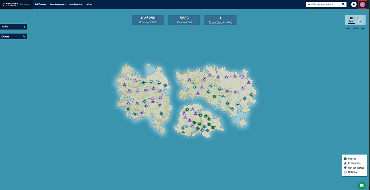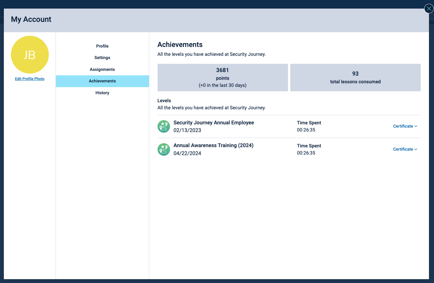 June 2, 2025 Where can I download my Security Journey certificates? Security Journey Certificates Once you complete a path, you can download you certificate from your User Profile (Top Right). Additionally, the Achievements tab will show points and total lessons consumed.